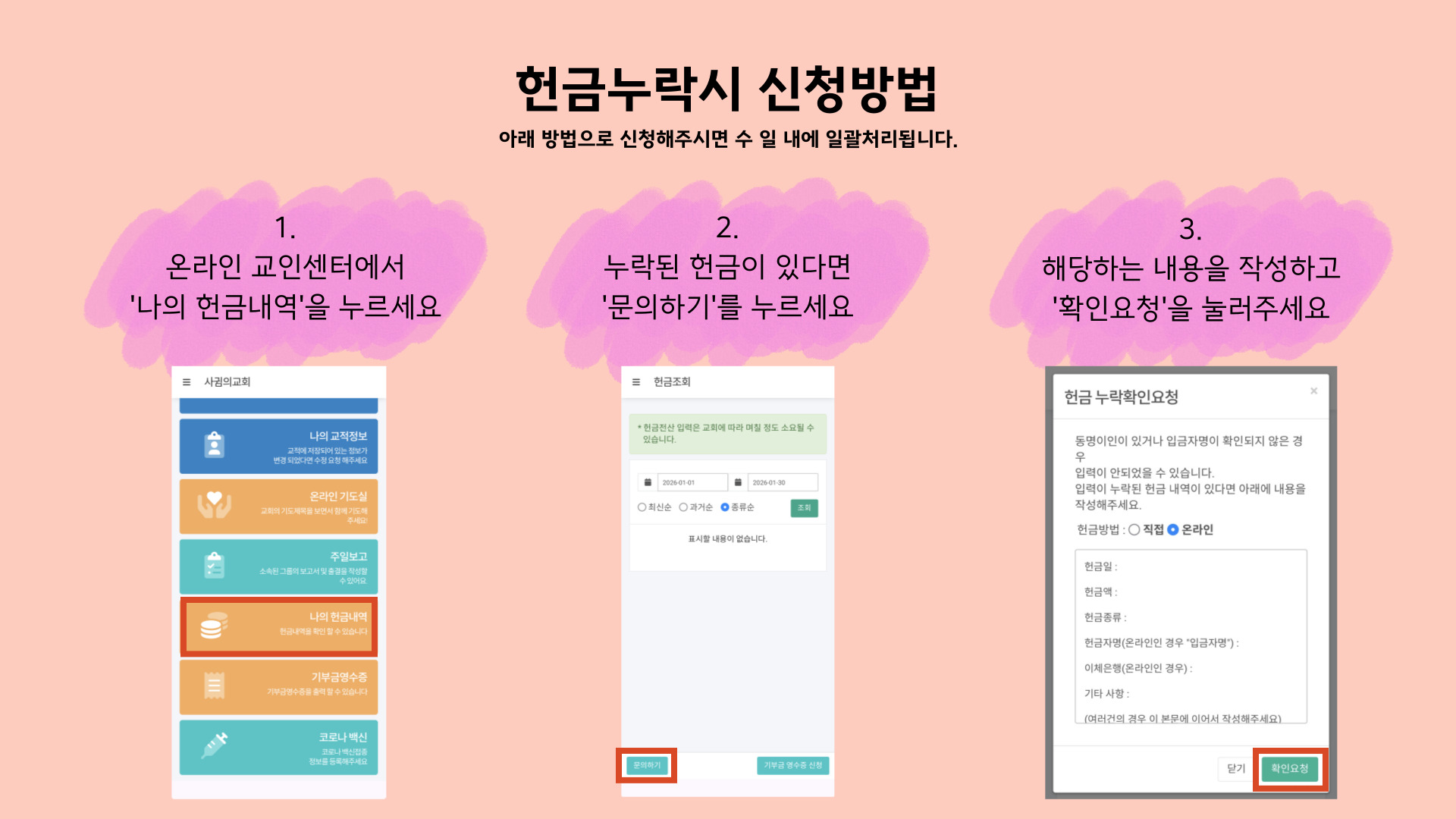 교회에 현금으로 헌금하신 내역이 헌금 기록에 반영되지 않은 경우, 아래 절차에 따라 현금 누락 확인 신청을 해주시기 바랍니다.