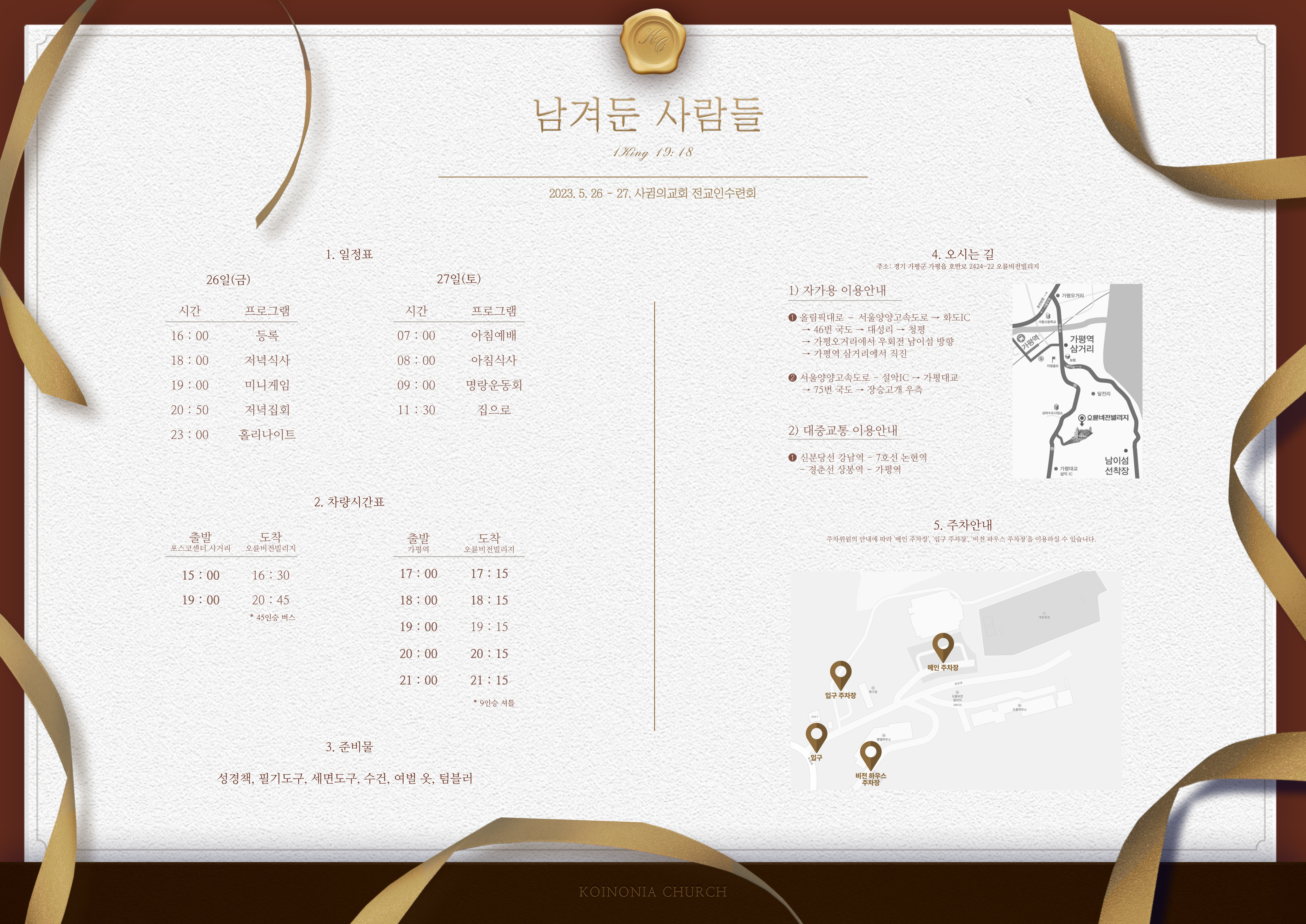 전교인수련회 관련 일정, 차량 등 내용을 안내해드리니 참고해주시기 바랍니다.